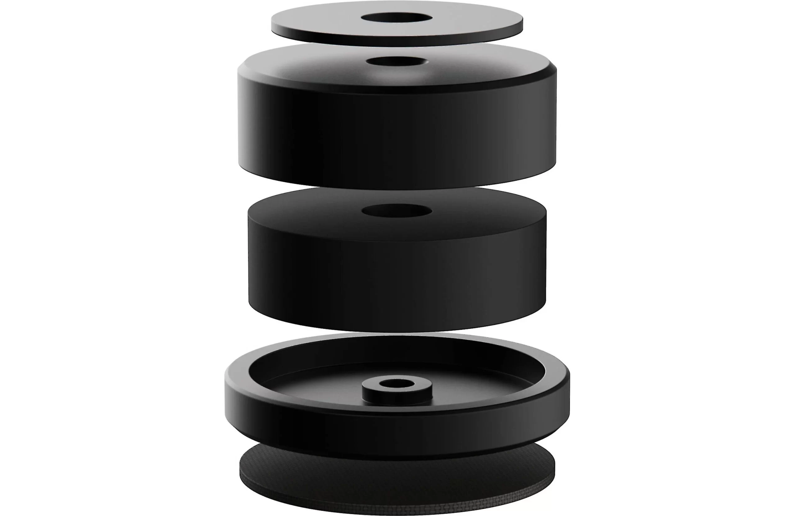 שלוש רגליות מתכווננות בגובה עם בסיס מתכת מעובד בטכנולוגיית Damp-it וסופגי TPE – לבידוד יעיל מרעידות סביבתיות ורעש רזוננטי מהרמקולים.