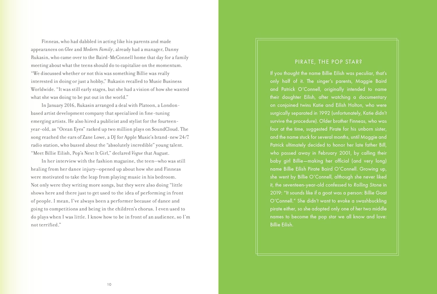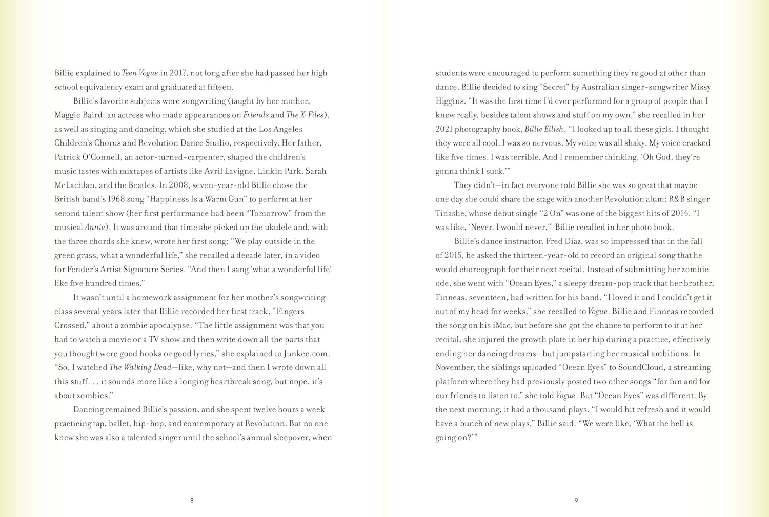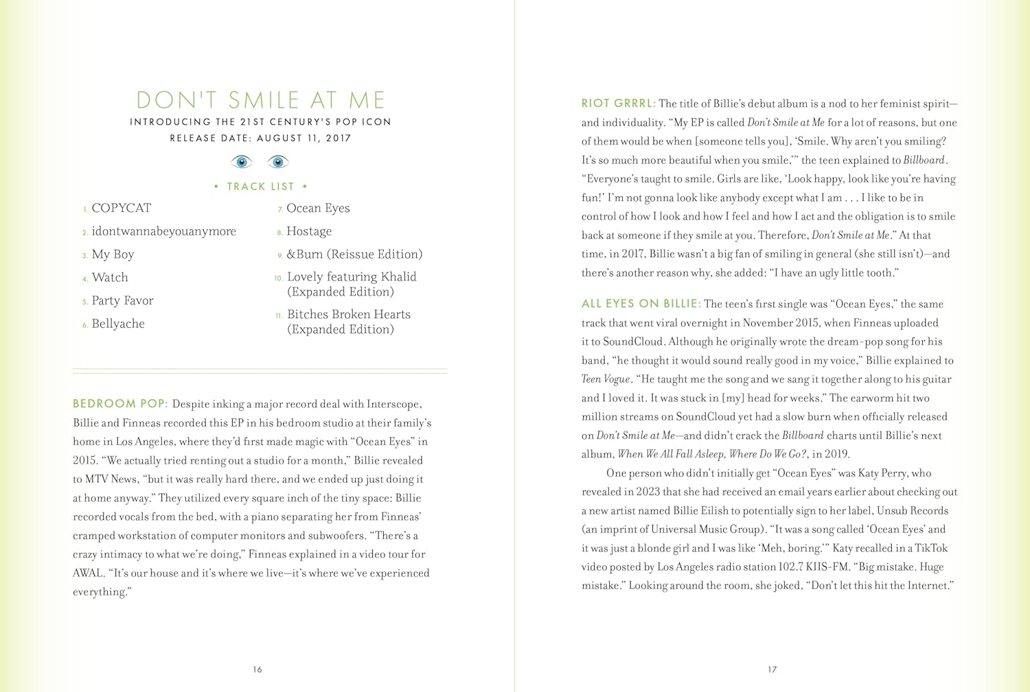 A full biography, delving into her early life and inspirations, her collaborations with her brother Finneas, and her amazing musical career to date A discography of Billie Eilish’s music, including When We All Fall Asleep, Where Do We Go?, Happier Than Ever, and Hit Me Hard and Soft All her awards and accolades across music and movies Billie’s fierce commitment to being herself, from her unique—and evolving—style to her political activism